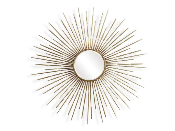 Inspired by mid-century designs, this starburst mirror is finished in an antiqued gold leaf and features a 1″ bevel.