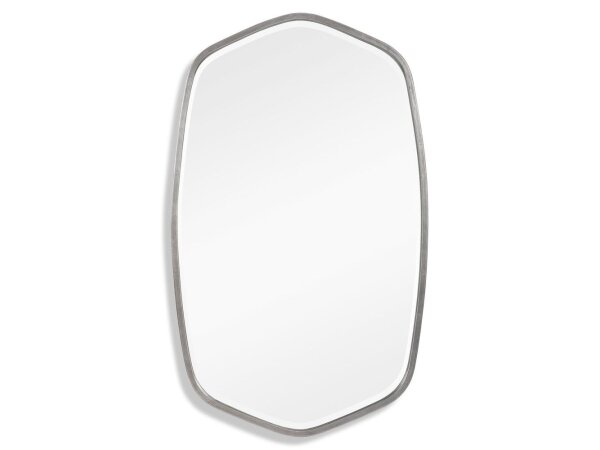 Hand forged iron coils, finished in a satin black, accented with a subtle hammered texture. Mirror features a generous 1