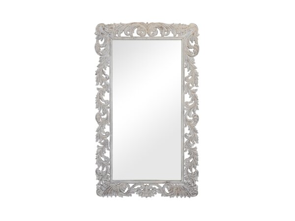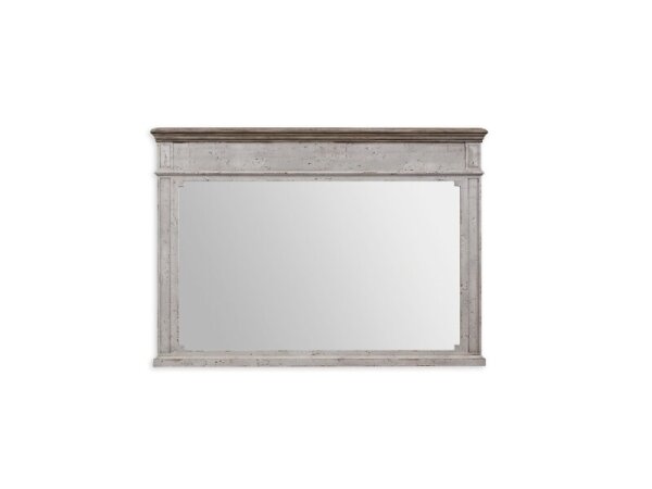 Farmhouse wall mirror with planked panels and detailed antiquing, finished in multi-layer Dover White with a Cobblestone Grey top in a waxed wool finish. 48 in. W x 34 in. H.