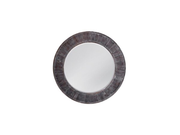 Round wall mirror with a wood frame in a stormy grey washed finish for a bold, modern accent.