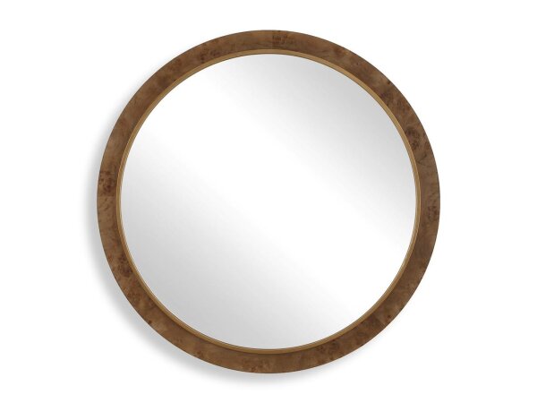 The Cleveland Round Mirror features a stunning burl veneer frame, showcasing the natural grain and color, accented by an iron