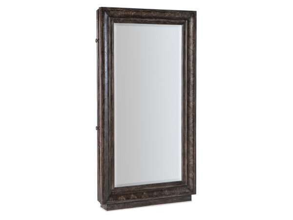 Beveled floor mirror with hidden jewelry storage featuring dual felt-lined pullouts, each with necklace hooks and trays. Pine veneers with a distressed finish keep accessories organized and concealed.