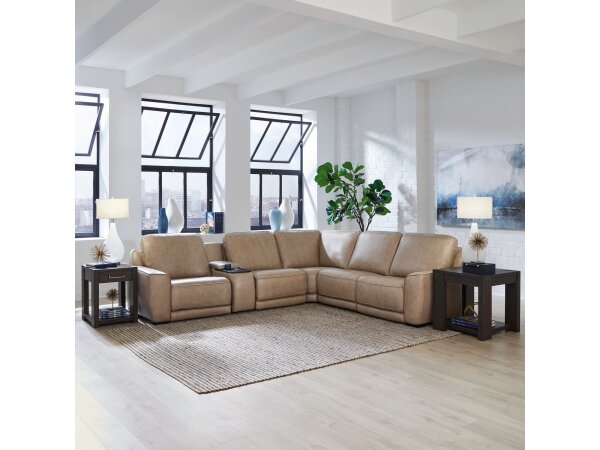 This left-arm recliner offers a triple zero gravity power recline with an articulating headrest and powered lumbar support. It is crafted with semi-aniline top grain leather and includes built-in USB-A and USB-C charging ports.
