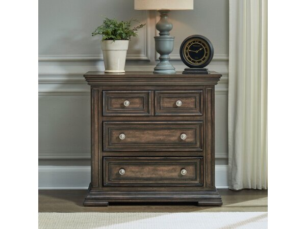 This South Bend nightstand features a modern design with a Burnished Clay finish, faux concrete top, and is crafted from Rubberwood solids and White Oak veneers. It includes a built-in charging station with 2 AC outlets, 1 USB-A, and 1 USB-C port, alongsi