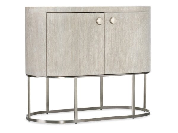 Demilune nightstand with a white and gray marble top, metal frame, and two self-closing drawers. Crafted from oak veneers in a Diamond wire-brushed finish.