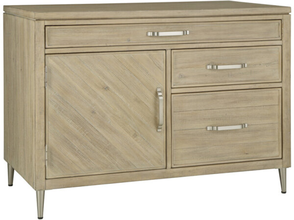 Oak veneer file cabinet in a Terrain taupe finish with dry-brushing and champagne tab pulls. Two soft-close doors conceal a locking file drawer and a fixed shelf for streamlined storage.