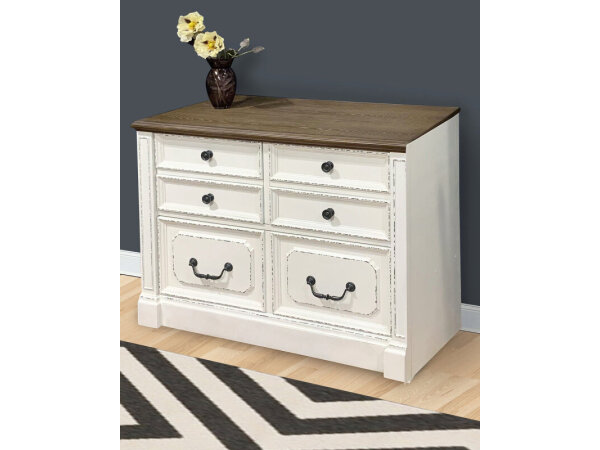File cabinet in oak veneers with a smoked gray Mink finish and antique pewter bar pulls. Includes a top utility drawer and a lower locking file drawer with pendaflex filing, finished on the back for floating use.