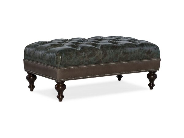 Rectangular leather ottoman with a tufted top and tall, tapered wood legs, with supportive webbed construction for use as a footrest, tray surface, or extra seat.