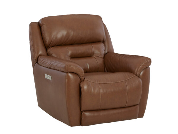 The “Contender” is a sophisticated reclining group in top-grain leather, featuring a power headrest, a power lumbar, and an extended