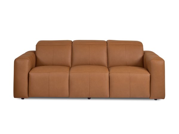 The Blair sofa in Cognac leather features dual zero gravity power recline with a power articulating headrest for optimal comfort and posture benefits. It includes bucket seating, head-to-toe support from a full pad-over chaise, and convenient USB-A and US