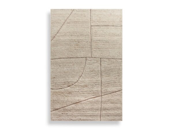 The Kenyan Rug features tufted construction using undyed wool in beige and brown tones, showcasing a geometric cutout pattern with