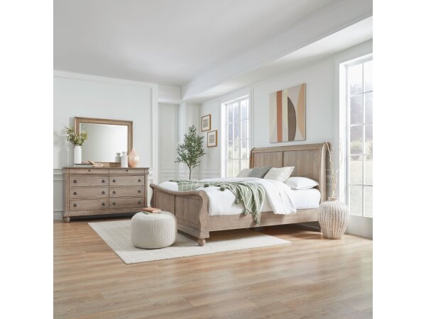 This landscape mirror features a classic design with picture frame and bead molding. A one-inch beveled edge on the glass adds a touch of sparkle, and it includes bolt-on supports for easy attachment to a dresser.