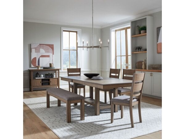 Add versatile seating to your dining area with this upholstered bench, featuring a durable 100% polyester grey linen seat. It stands on sturdy block style legs and includes nylon glides to protect floors.