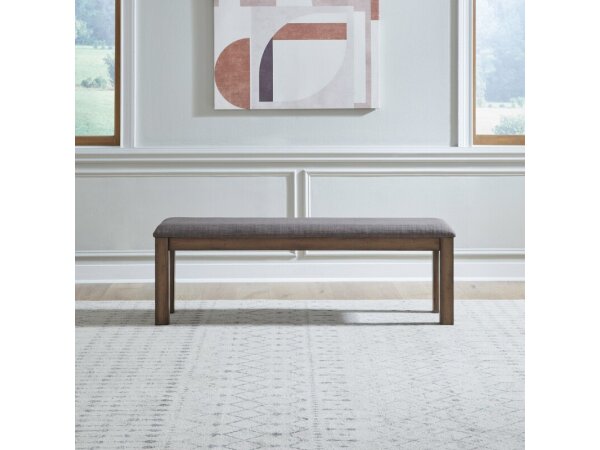 Add versatile seating to your dining area with this upholstered bench, featuring a durable 100% polyester grey linen seat. It stands on sturdy block style legs and includes nylon glides to protect floors.