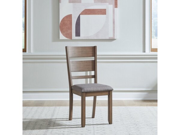 This upholstered, ladder back side chair offers a classic look with its 100% polyester grey linen upholstery. The design is completed with square block legs and protective nylon chair glides.