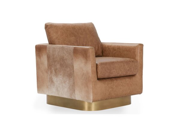 The Lathe Accent Chair combines luxury and style with its unique hair on hide upholstery. The striking gold base adds