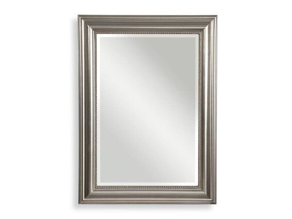 Textured metal frame finished in a lightly antiqued metallic silver. Mirror has a generous 1 1/4″ bevel and may be