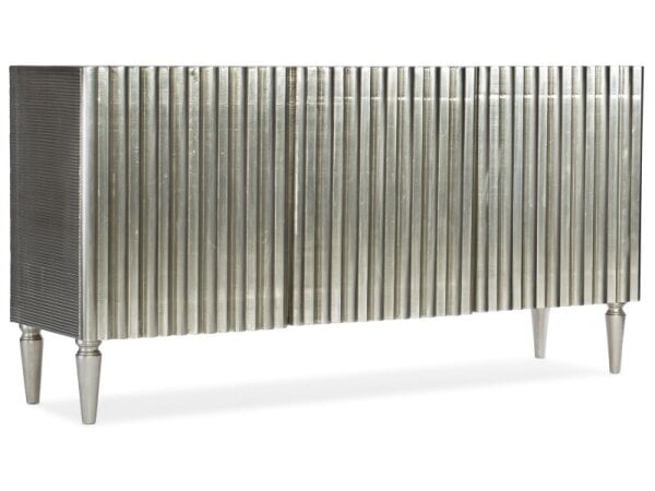 Striking 78 in. entertainment console wrapped in German silver foil over mango wood for a jewelry-like sheen. Four doors conceal removable shelves with ventilated backs in each section, accommodating TVs up to 80 in.