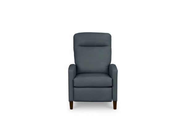 Modern leather recliner with track arms, channeled headrest, and tapered wood legs for a tailored living room look. Lay-flat manual recline, with optional power and USB for convenience.