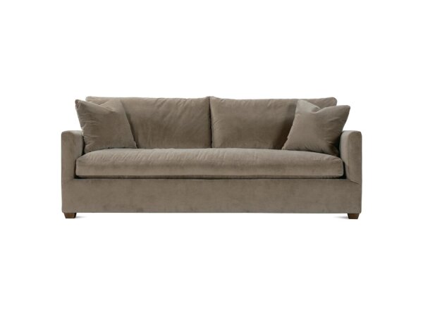 Modular L-shaped sectional with wedge arms, customizable configuration, cushions, and fabric. Top-stitched, welt-less box seats with removable back and seat cushions.