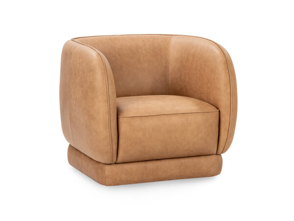 Low-profile leather chair with wide track arms and deep seating for relaxed lounging. Loose, removable back cushions and thick padding add lasting comfort.