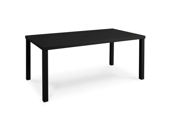 Powder-coated aluminum outdoor dining table with a slatted-look top and umbrella hole; seats 6. Measures 72 in. W x 38.3 in. D x 30 in. H; crafted in Alabama.