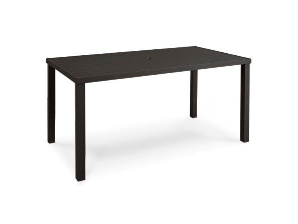Clean-lined aluminum outdoor dining table with a slatted-look top and umbrella hole with plug. Seats 4; 38.5 in. W x 38.5 in. D x 30 in. H, made in USA with leveling feet.