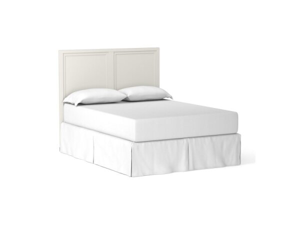 White panel bed with raised framing details and a smooth Hampton White finish. Streamlined legs feature satin brass metal ferrules for a refined, timeless look.