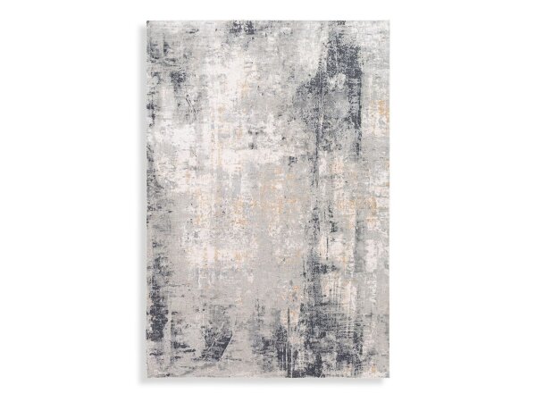 This machine woven rug features an abstract design in tones of light gray, off-white, charcoal and subtle tones of mustard,