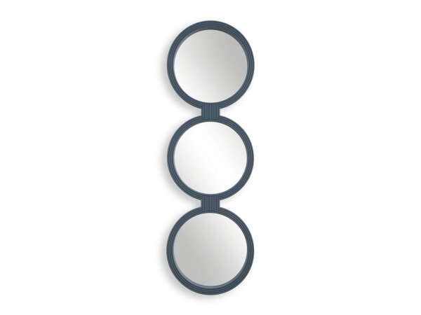 Three interconnected round mirrors, each framed with a continuous ribbed texture in a muted blue-gray finish, creating a piece that