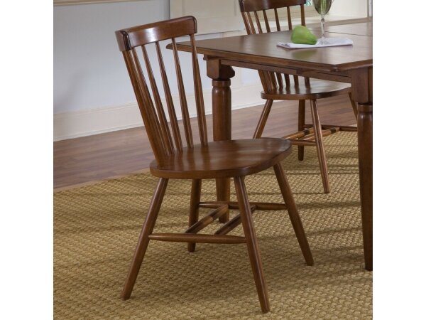 Crafted from rubberwood solids with a tobacco finish, this Creations Copenhagen side chair features a sturdy spindle back, splayed legs, and a contoured seat for comfort. Nylon chair glides protect your flooring.