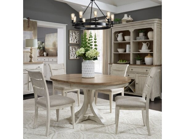 The Farmhouse Reimagined lateral file, crafted from pine solids and veneers, features a two-toned antique white finish with chestnut tops. It offers two full extension, locking file drawers with chamfered fronts and heavy distressing.