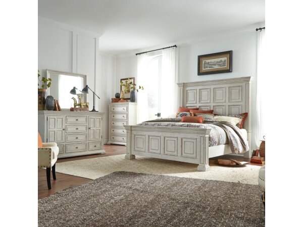 This Queen mansion headboard, crafted from Rubberwood solids with a distressed Whitestone finish, features elegant heavy crown molding and windowpane accents. It also includes graduated bead molding and square post pilasters for architectural interest.