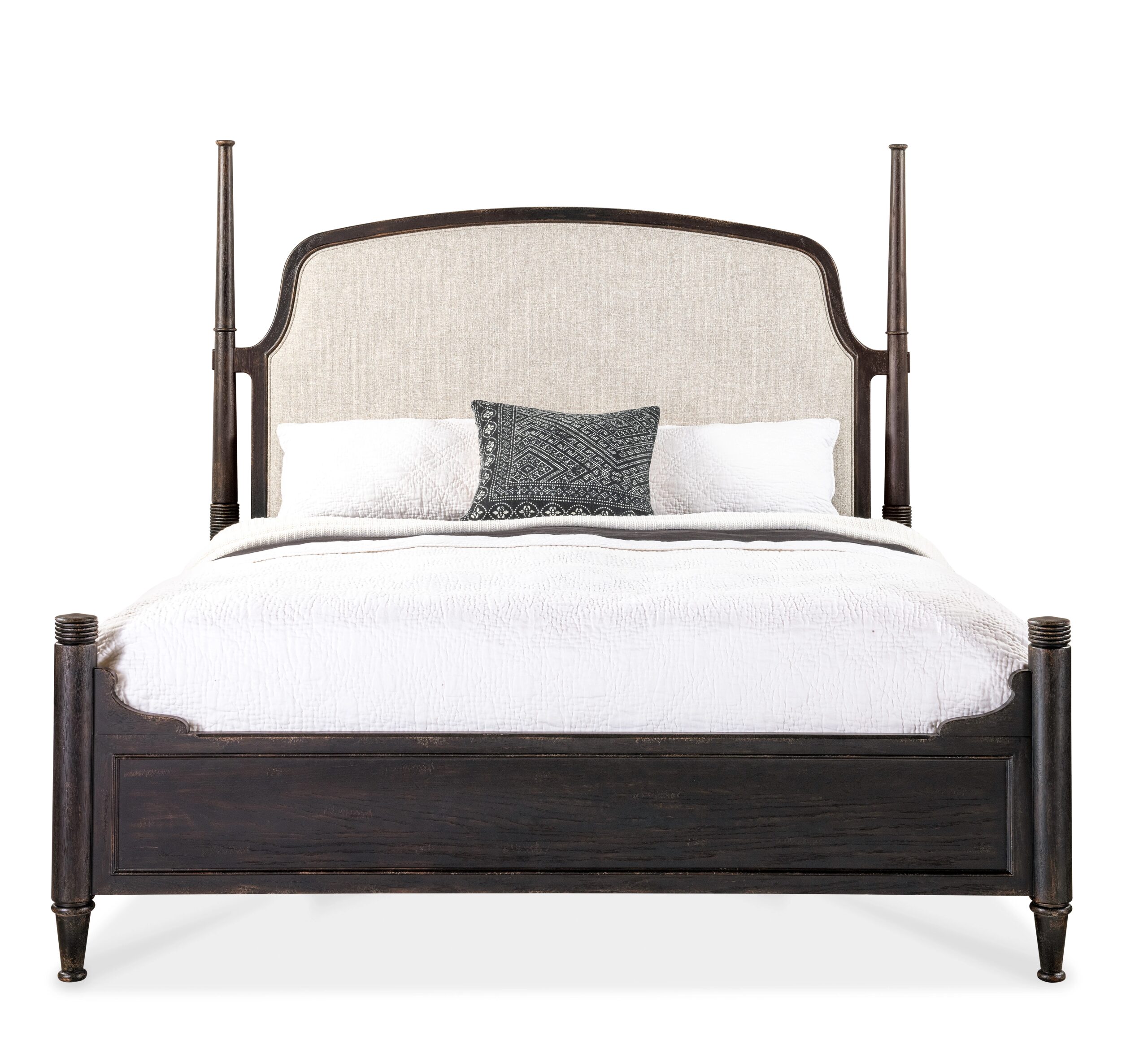 In a stunning reimagination of the classic Southern 4-poster bed, the inviting Americana Queen Upholstered Bed has an upholstered fabric headboard with welt trim, in a creamy white color contrasting with the deep, dark Molasses finish over Cathedral Oak Veneers. There are carved accents on the posts and scroll work on the upper sides of the footboard. The footboard comes with caps for a low-post option.