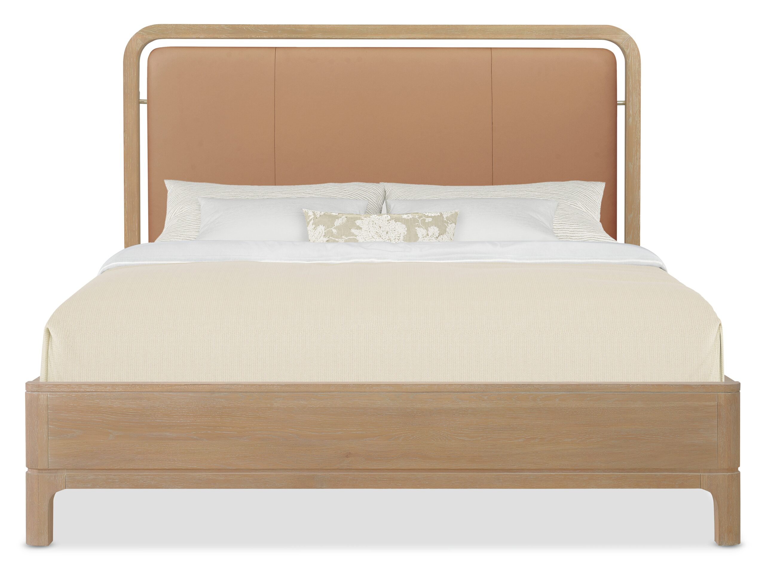 The Banyon Bay California King Panel Bed in the Toast leather blends contemporary design with the finest materials. Featuring white oak solids, oak veneers, and finished leather, it showcases a multi-step Desert Oak finish with wire-brushing and cerusing. The leather-upholstered headboard has an open frame supported by metal, adding both structure and style. This California King bed is the perfect focal point for any modern bedroom, offering elegance and comfort in one piece.