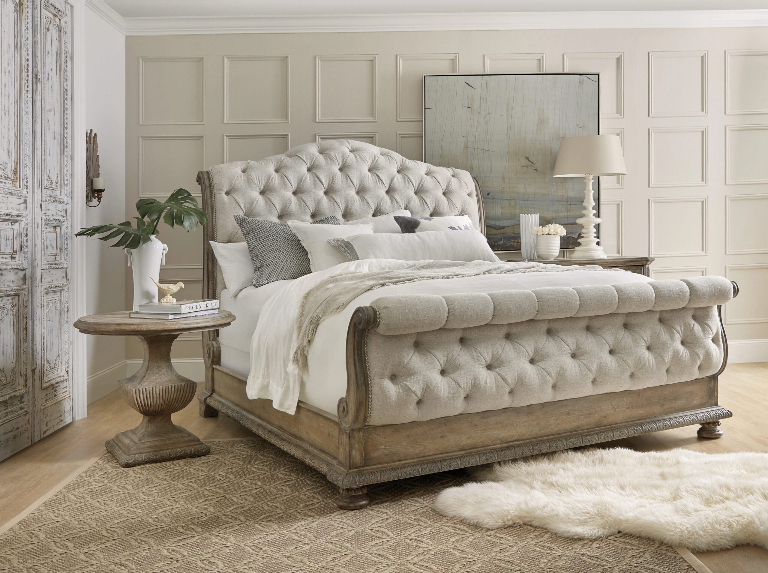 Grand scale and soft, sweeping lines infuse the statement Castella King Tufted Bed with emotion. Upholstered in a beautifully woven multi-dimensional texture fabric in a creamy Natural Tan performance fabric with repeated tufting for a plush appearance, the bed is easily mixed with any color scheme. Acanthus leaf carving detail around the base of the bed adds the final touch of classic appeal to this over-the-top bed. Includes headboard, footboard and rails.