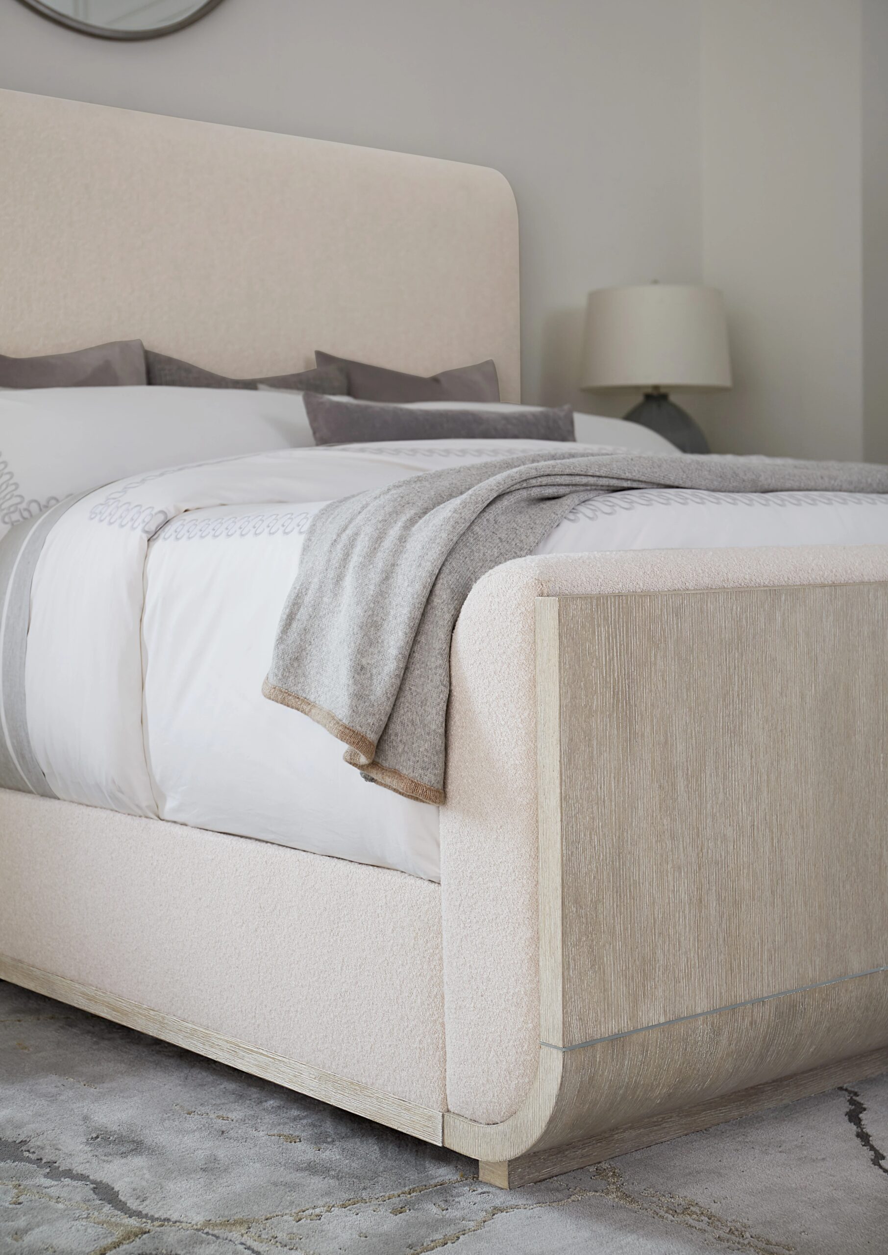 Serene, soft and stylish with a cloud-like floating appearance, the monochromatic Modern Mood Upholstered Bed is a stunning focal point for any bedroom space. The headboard, footboard and rails are upholstered in the Inverness Natural fabric, with trim in Quartered Oak Veneers finished in Diamond and accented with metal for a luxe mixture of materials. Includes headboard, footboard and rails.