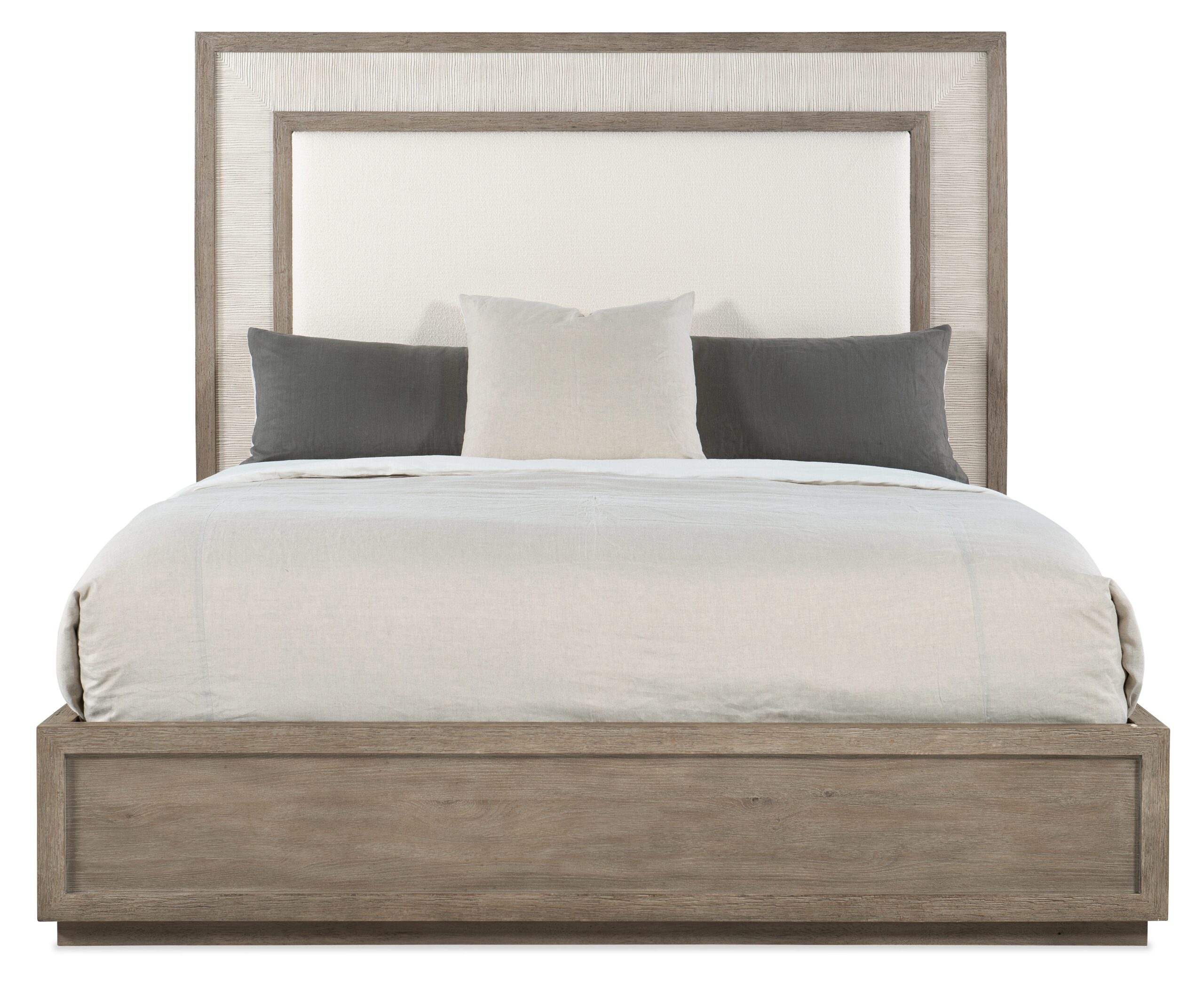 In a crisp two-tone finish combining a gray washed oak with a contrasting textured light gray color, the Serenity Rookery King Upholstered Panel Bed brings the organic tones and textures of cottage waterfront living to your bedroom retreat. Crafted of Oak Veneers with the Macrame Artic fabric on the upholstered headboard, the bed includes the headboard, footboard and rails. The headboard can be used alone.