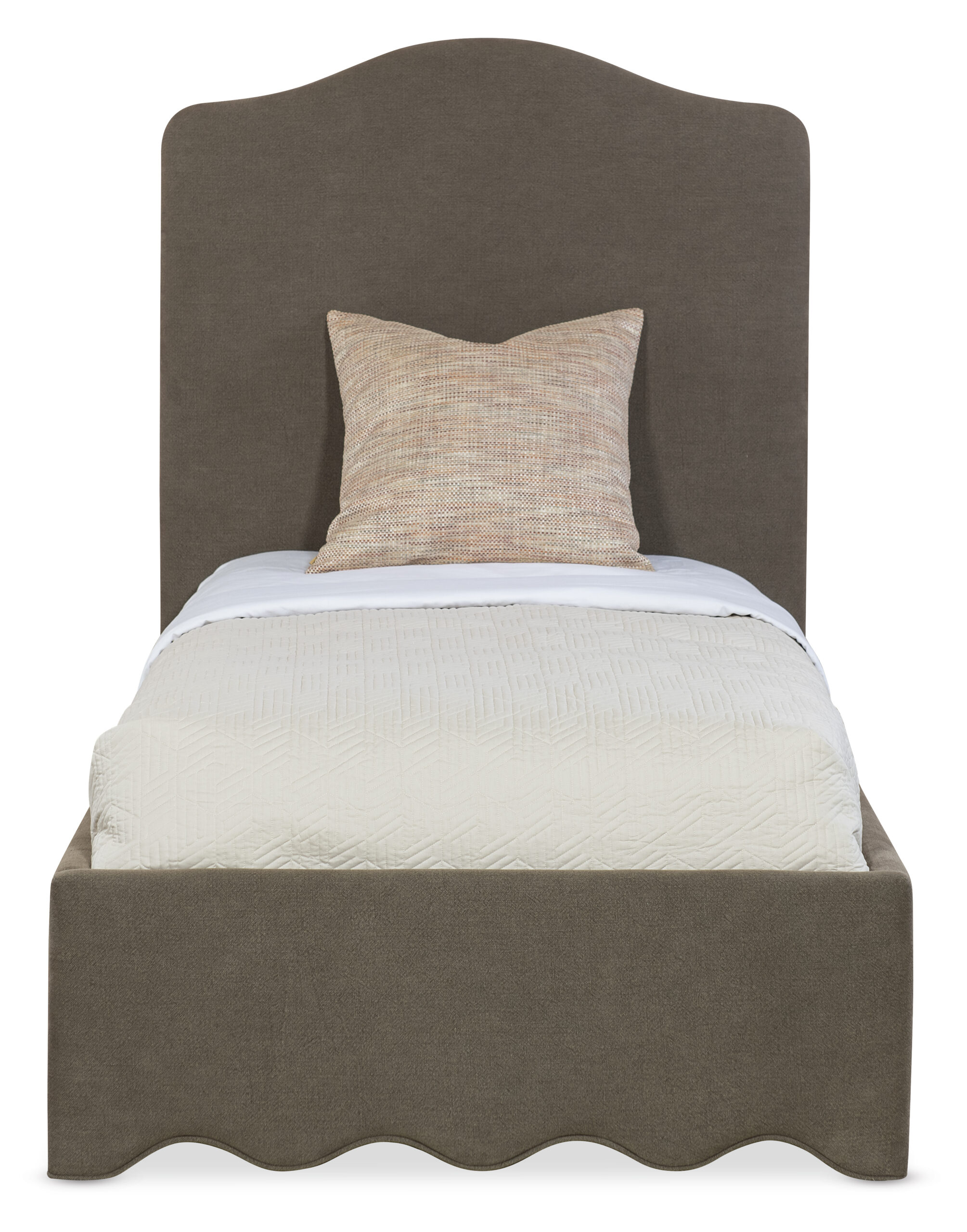 Warm and inviting, the Liv Twin Upholstered Bed in Broadway Coffee linen offers a rich, cozy take on a twin-size upholstered bed. The fully fabric-wrapped frame and scalloped base add vintage-inspired detail, perfect for traditional or layered transitional interiors.