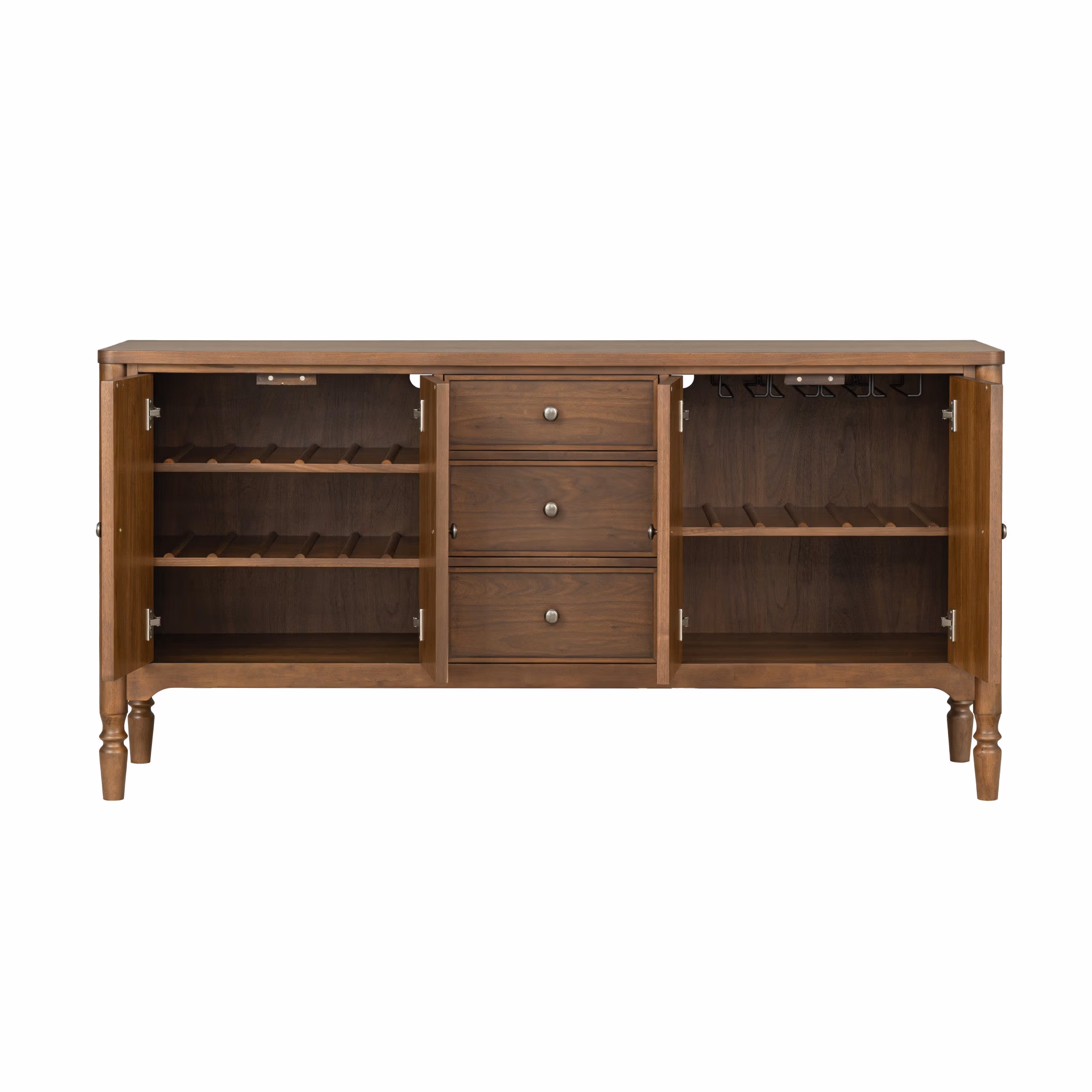 The Azalea sideboard is rooted in new traditional style, featuring classically designed picture frame drawer fronts and turned legs that bring a sense of craftsmanship to the dining space. Crafted from rubberwood solids with walnut veneers, the sideboard is finished in a rich Legacy Walnut tone that adds warmth and continuity throughout the collection. Designed for both entertaining and everyday use, this piece offers generous storage, integrated power, and thoughtful interior organization that support modern dining needs while maintaining the collection’s timeless appeal.
