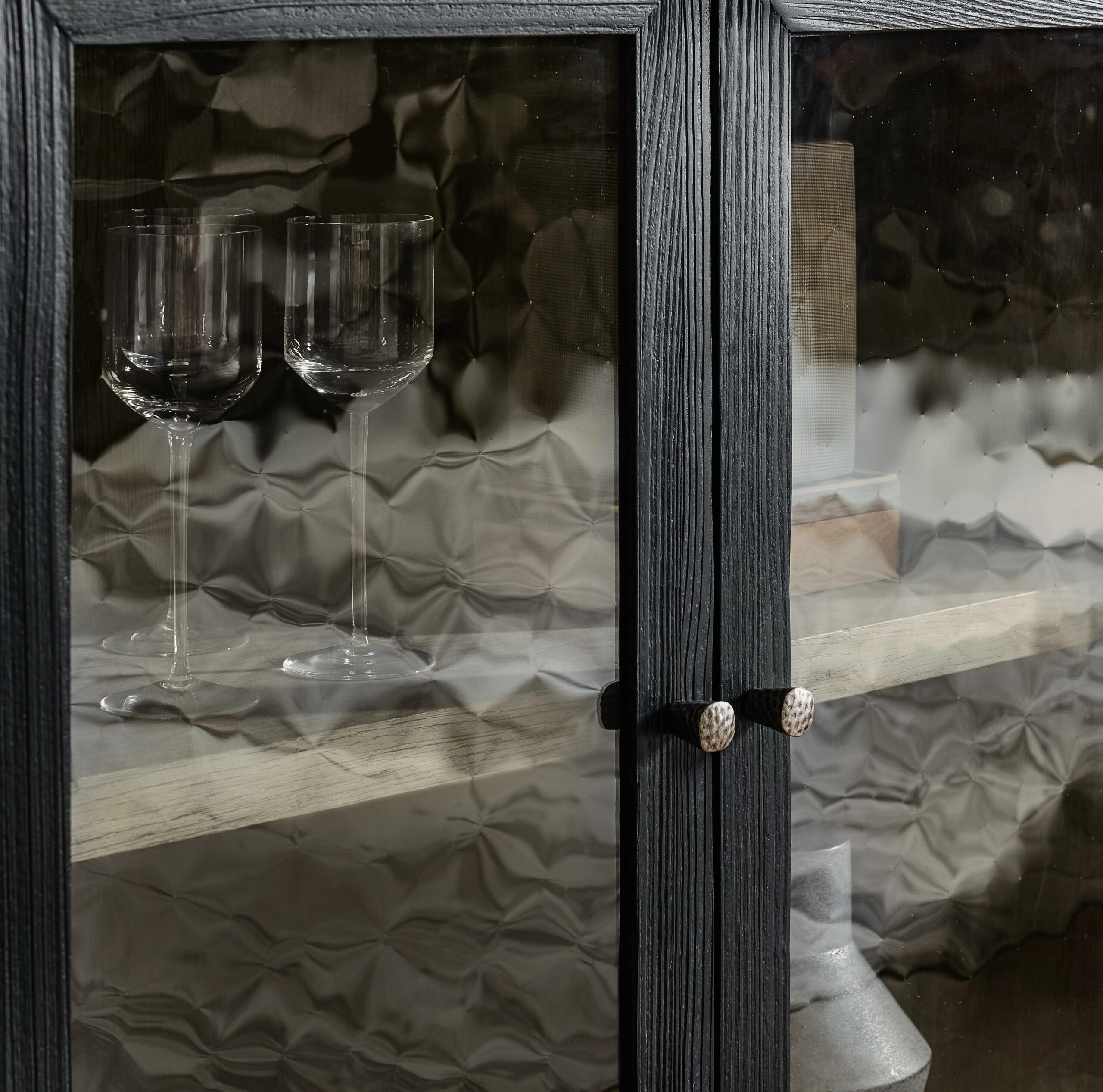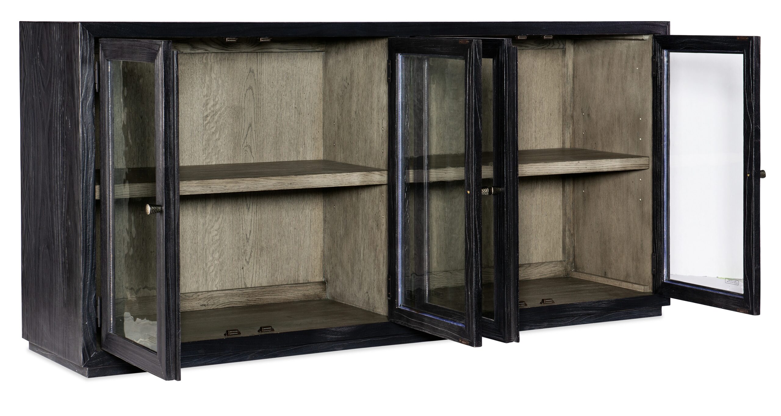 | Four wood-framed doors with seeded glass insertsTwo adjustable shelves behind each pair of doorsInterior is finished in Mink, a soft smoked gray finishFinish: Shadow: a charred black finish achieved through Shou Sugi Ban, a Japanese technique that creates | Yes |