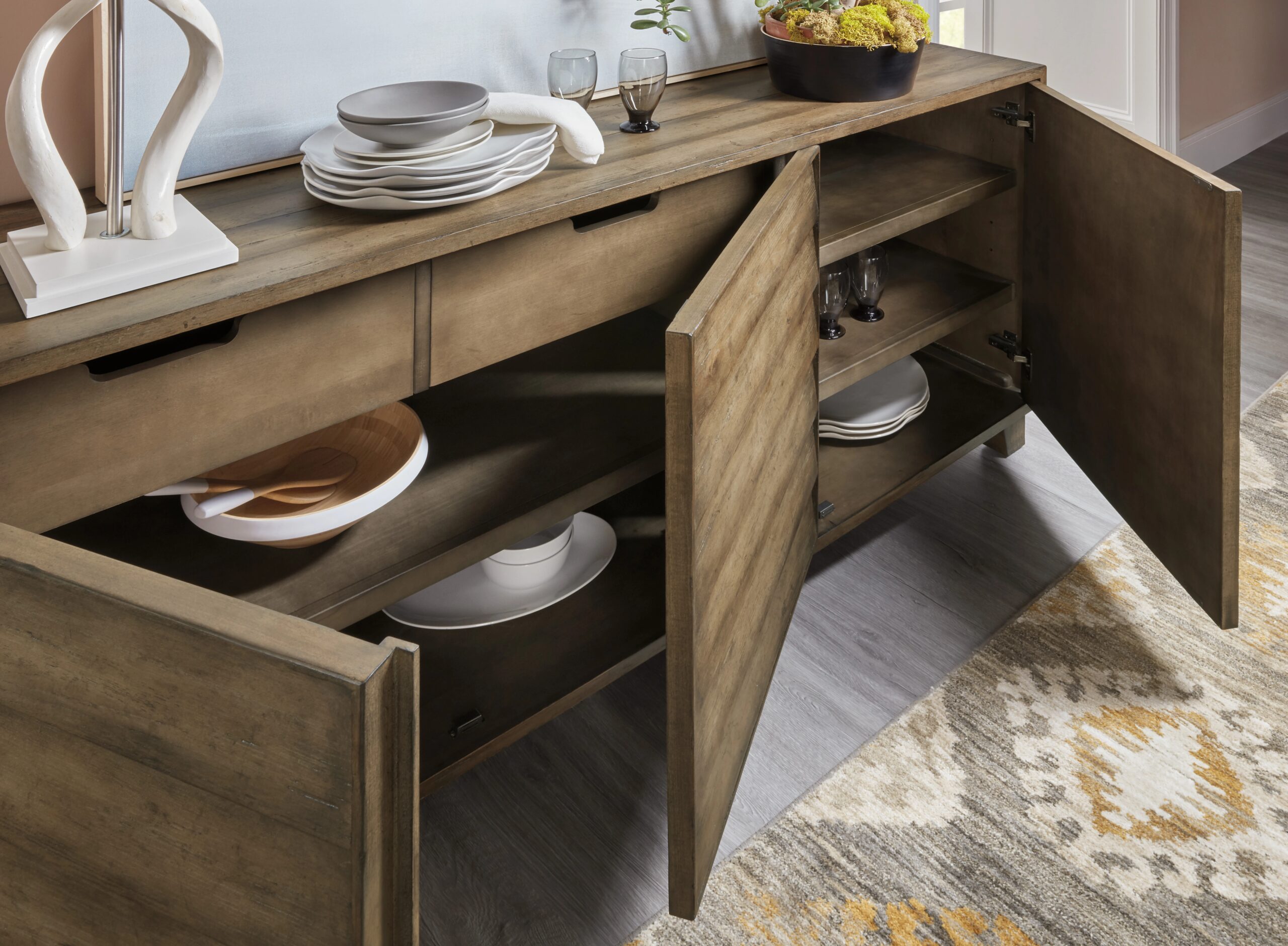 With a modern mountain aesthetic, the Sundance Buffet strikes a serene profile with resort-inspired shutter-like door fronts. The buffet features 3 doors with magnetic catches and soft-close hinges and two self-closing drawers behind a left pair of doors. The left drawer has a removable drop-in felt liner, and the right drawer has a removable felt silverware tray. There’s one adjustable shelf behind the left pair of doors and two adjustable shelves behind the right door. Crafted of Quartered Pine and Maple Veneers with a Solid-Wood edge top and finished in the rich brown Cliffside.
