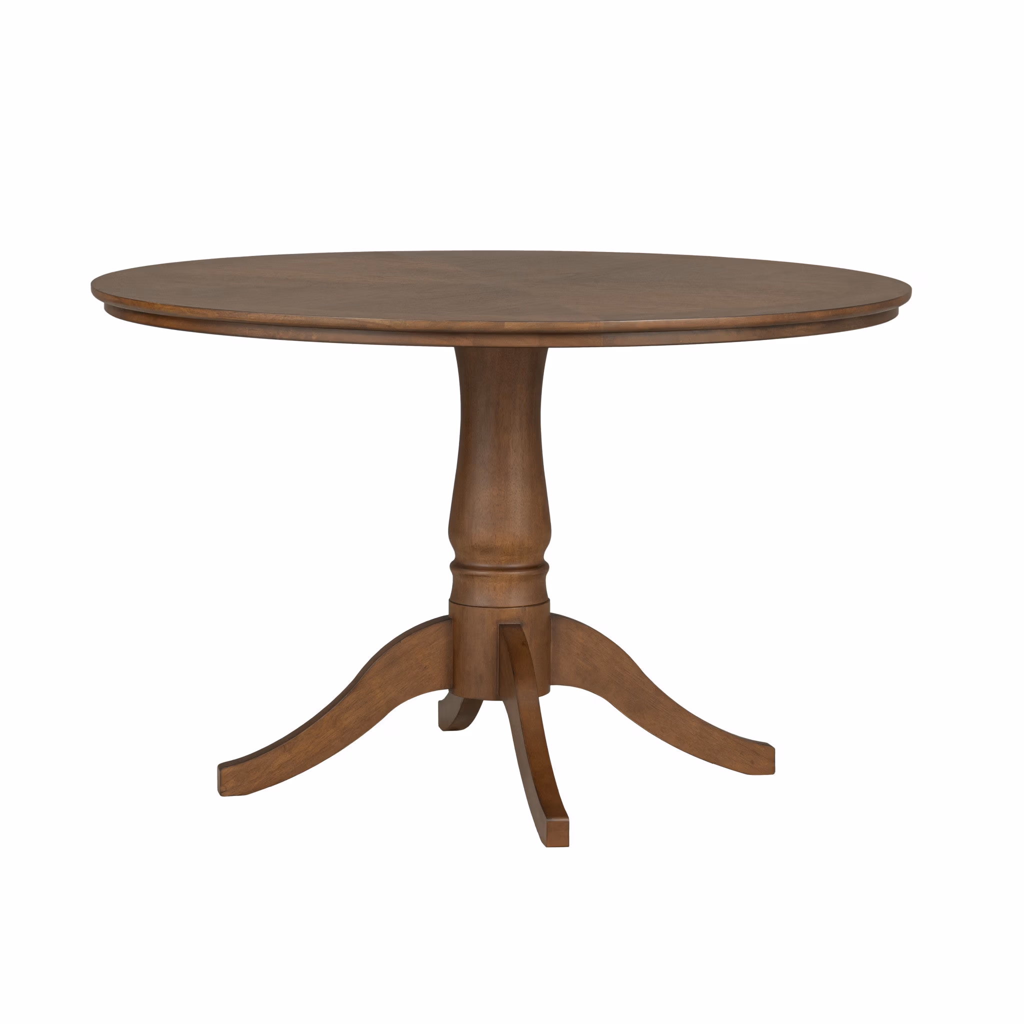 The Azalea round dining table is rooted in new traditional style, featuring classic proportions, butterfly match veneer top, and turned legs that create a welcoming, timeless presence. Crafted from rubberwood solids with walnut veneers, the table is finished in a rich Legacy Walnut tone that brings warmth and depth to the dining space. Its round silhouette and understated trestle base encourage connection and conversation, offering a refined yet approachable foundation for everyday meals and more intimate gatherings.