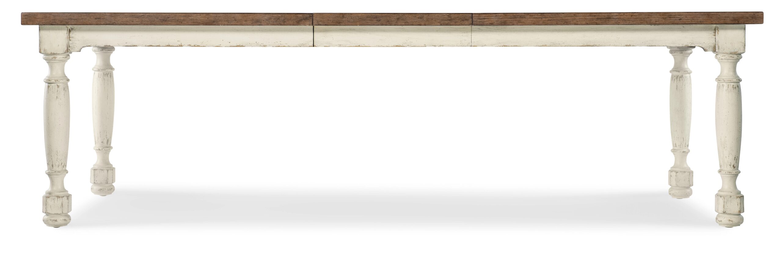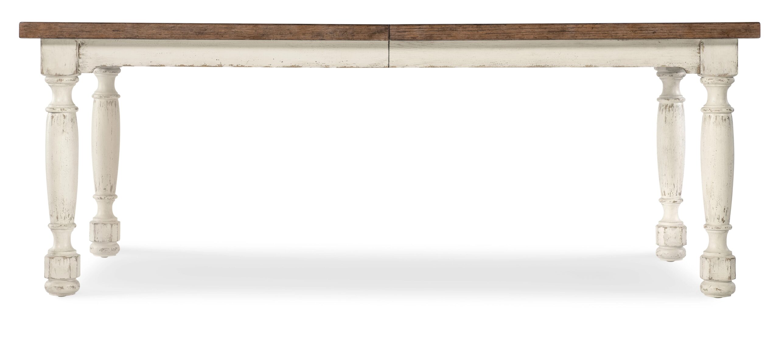 Combining the time worn white Daisy finish on the base and the warm Honey finish in a soft brown tone on the top, the Americana Dining Table harkens back to a simpler, more genteel time. Crafted of Oak Veneers with a Solid-Wood Edge Top, it has chunky turned legs and a shaped apron. What’s more, this table can be a real crowd-pleaser. With the 22-inch leaf in place, it extends to 102 inches long, accommodating up to 4 coordinating benches and two armchairs or up to 8 coordinating arm or side chairs. Without the leaf, it accommodates up to 6 coordinating arm or side chairs and up to two coordinating benches and two armchairs.