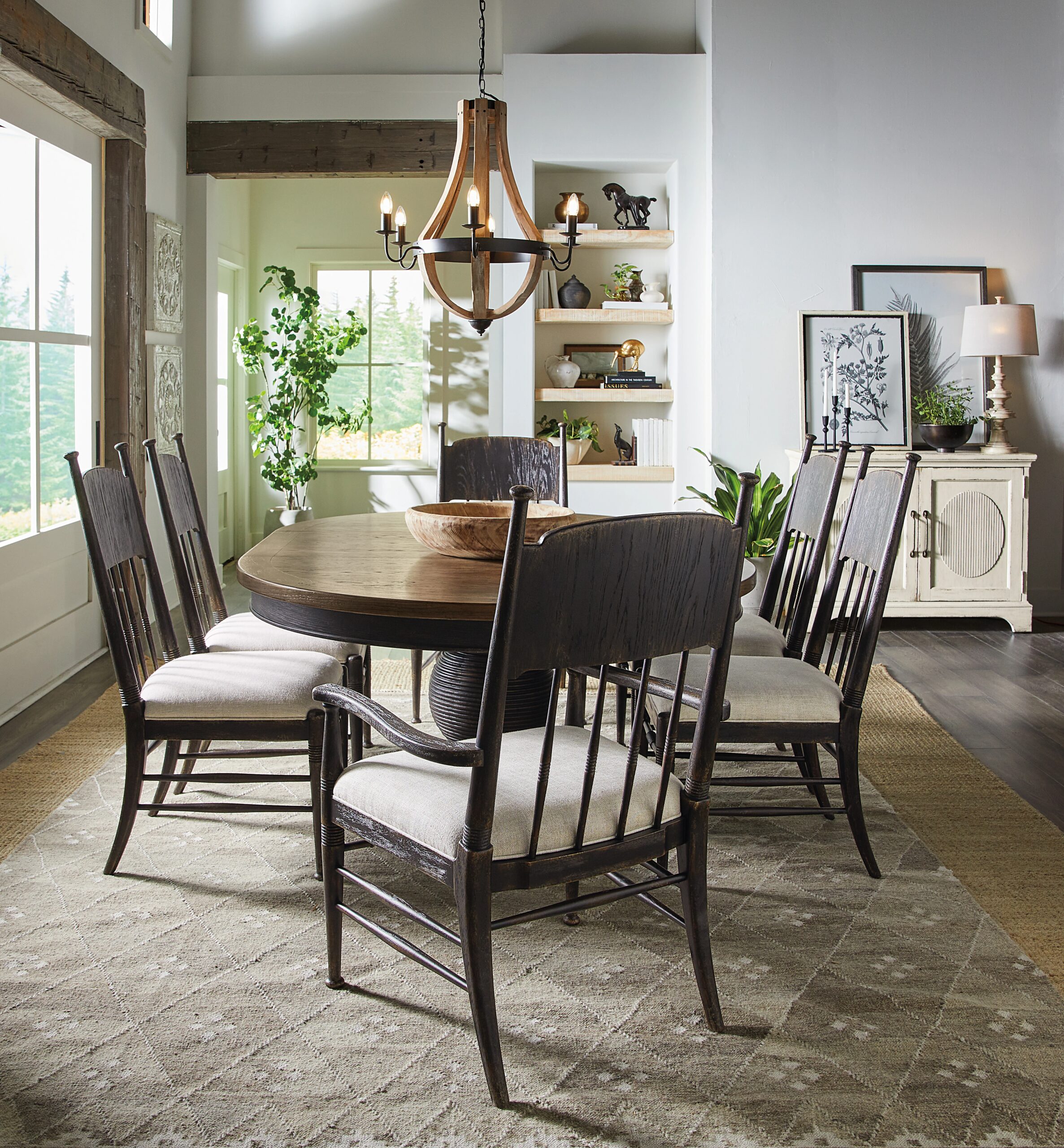 The Americana Round Pedestal Dining Table harkens back to a simpler, more genteel time. Crafted of Oak Veneers with a Solid-Wood Edge Top, it has a carved pedestal base. With the 22-inch leaf in place, the table extends to 76 inches round and accommodates up to two coordinating benches and two armchairs and up to 8 coordinating armchairs or side chairs. Without the leaf, it accommodates up to 6 coordinating arm or side chairs.
