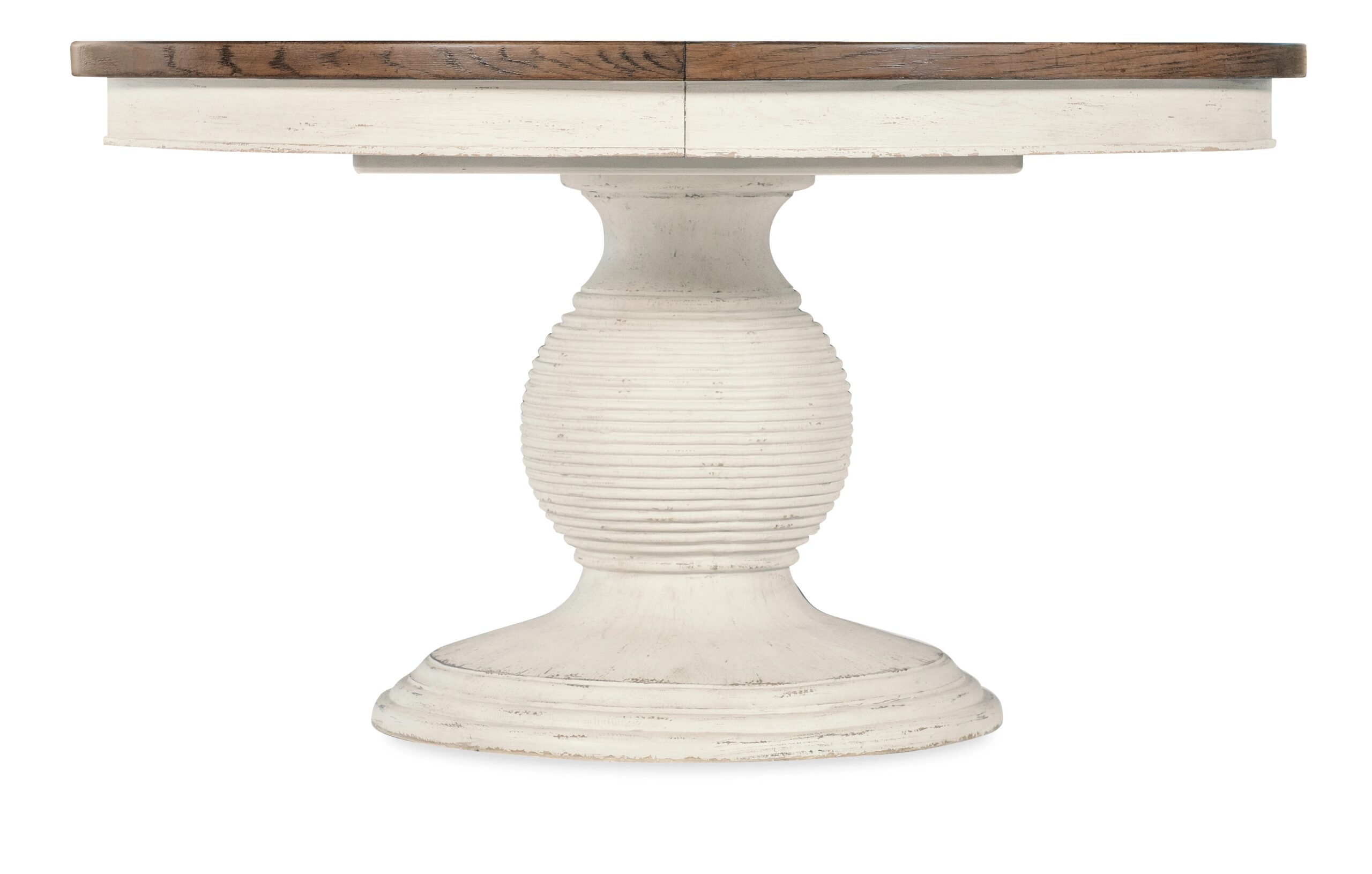 Combining the time worn white Daisy finish on the base and the warm Honey finish in a soft brown tone on the top, the Americana Round Pedestal Dining Table harkens back to a simpler, more genteel time. Crafted of Oak Veneers with a Solid-Wood Edge Top, it has a carved pedestal base. With the 22-inch leaf in place, the table extends to 76 inches round and accommodates up to two coordinating benches and two armchairs and up to 8 coordinating armchairs or side chairs. Without the leaf, it accommodates up to 6 coordinating arm or side chairs.