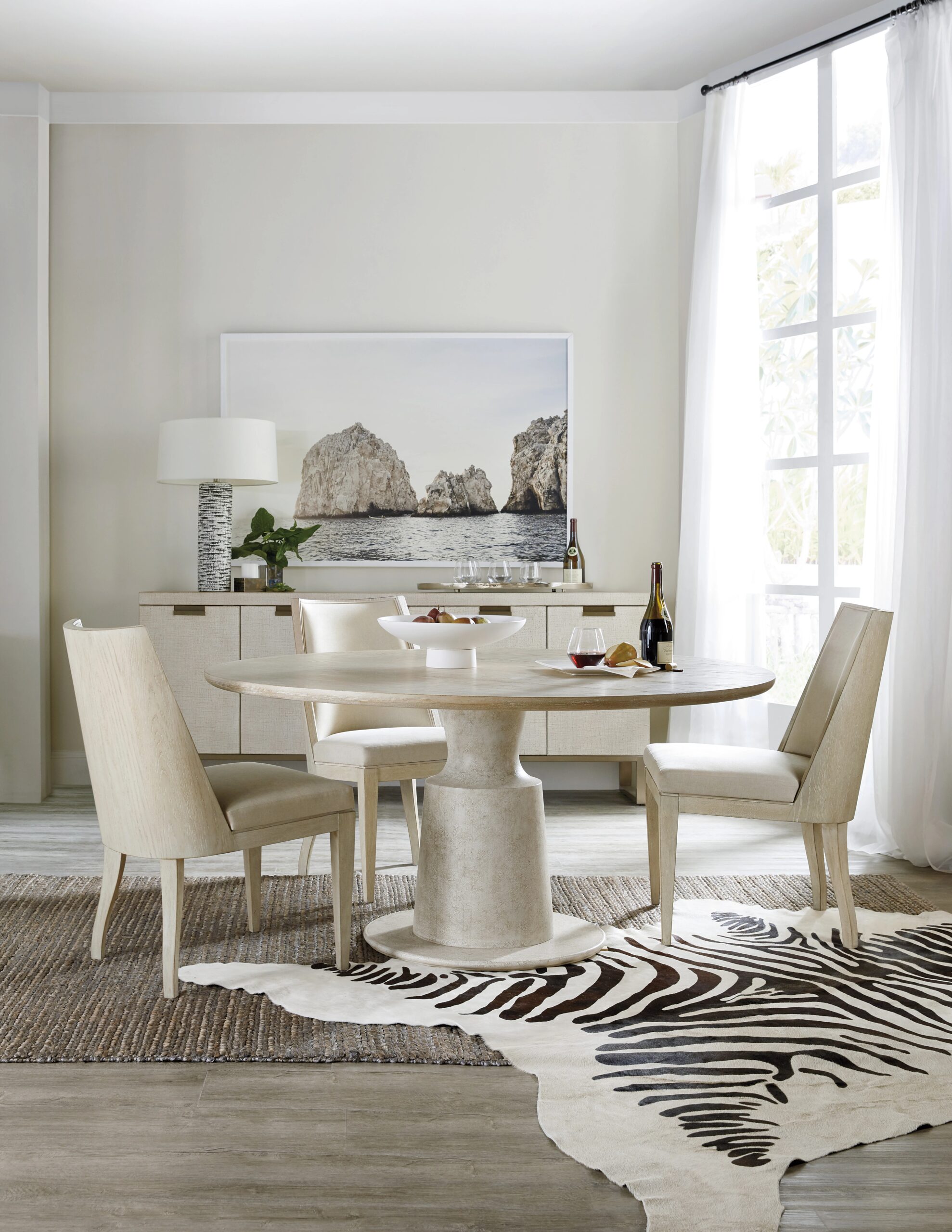 Gather around a table that offers a retreat from your fast-paced lifestyle with the Cascade Pedestal Table combining a shaped base in a textured gesso crackled finish with a tabletop crafted of Oak Veneers in a soft, dry-brushed taupe finish. Chic and inviting, the table accommodates 4 chairs comfortably.