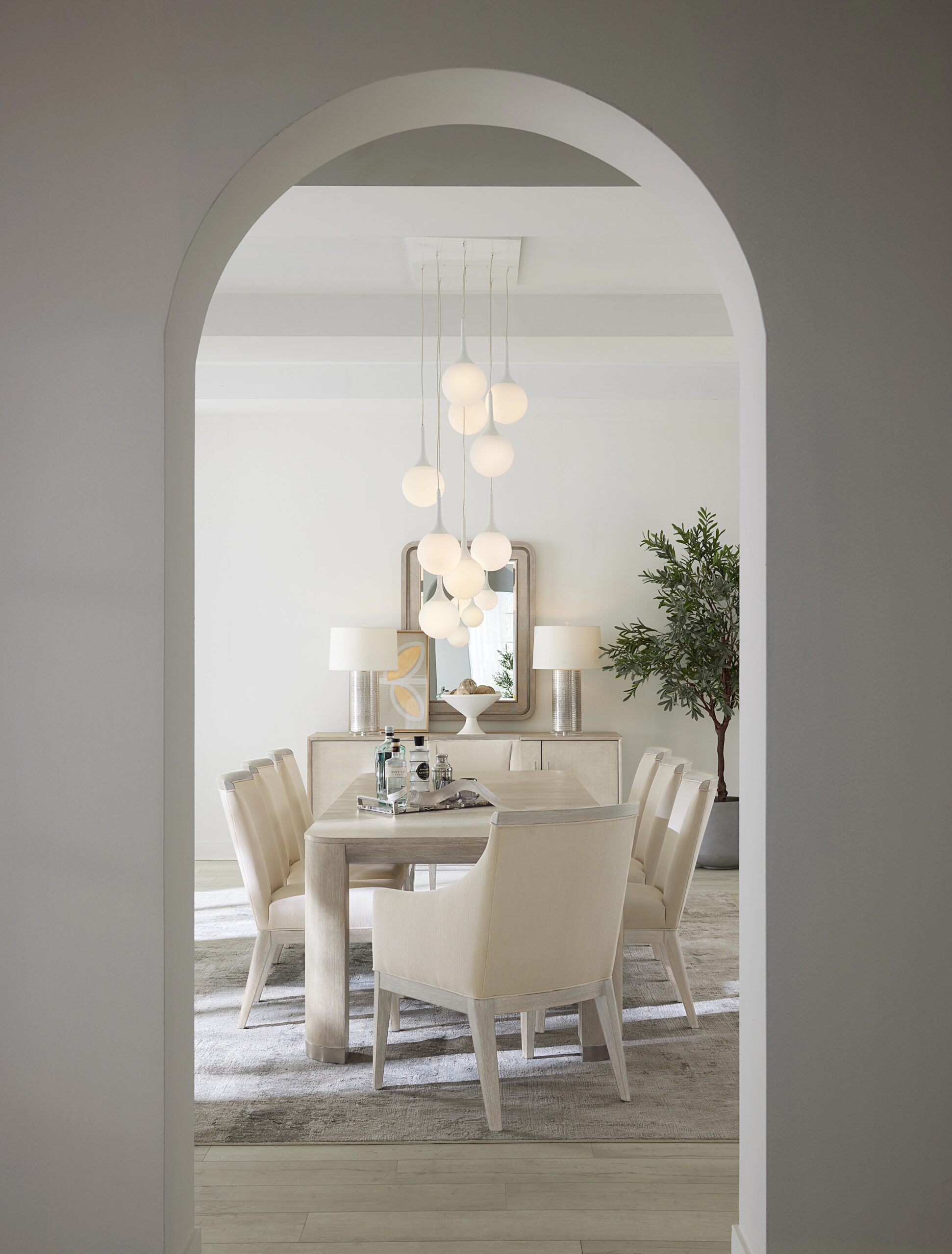 Inspired by decades of design movements with an unmistakably modern aesthetic that transcends time, the Modern Mood Leg Dining Table is a striking, softly sophisticated profile. Featuring a rounded table apron and corners, matched veneers on the top and metal banding accents on the legs in a warm pewter finish, it is crafted of Quartered Oak Veneers in a Diamond Finish with crystal-like alabaster hues. With one 24-inch leaf, the table extends up to 110 inches long.