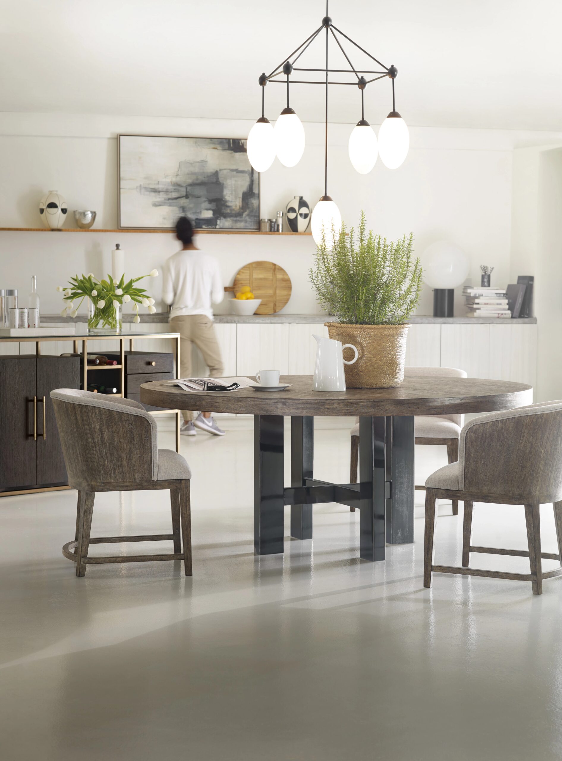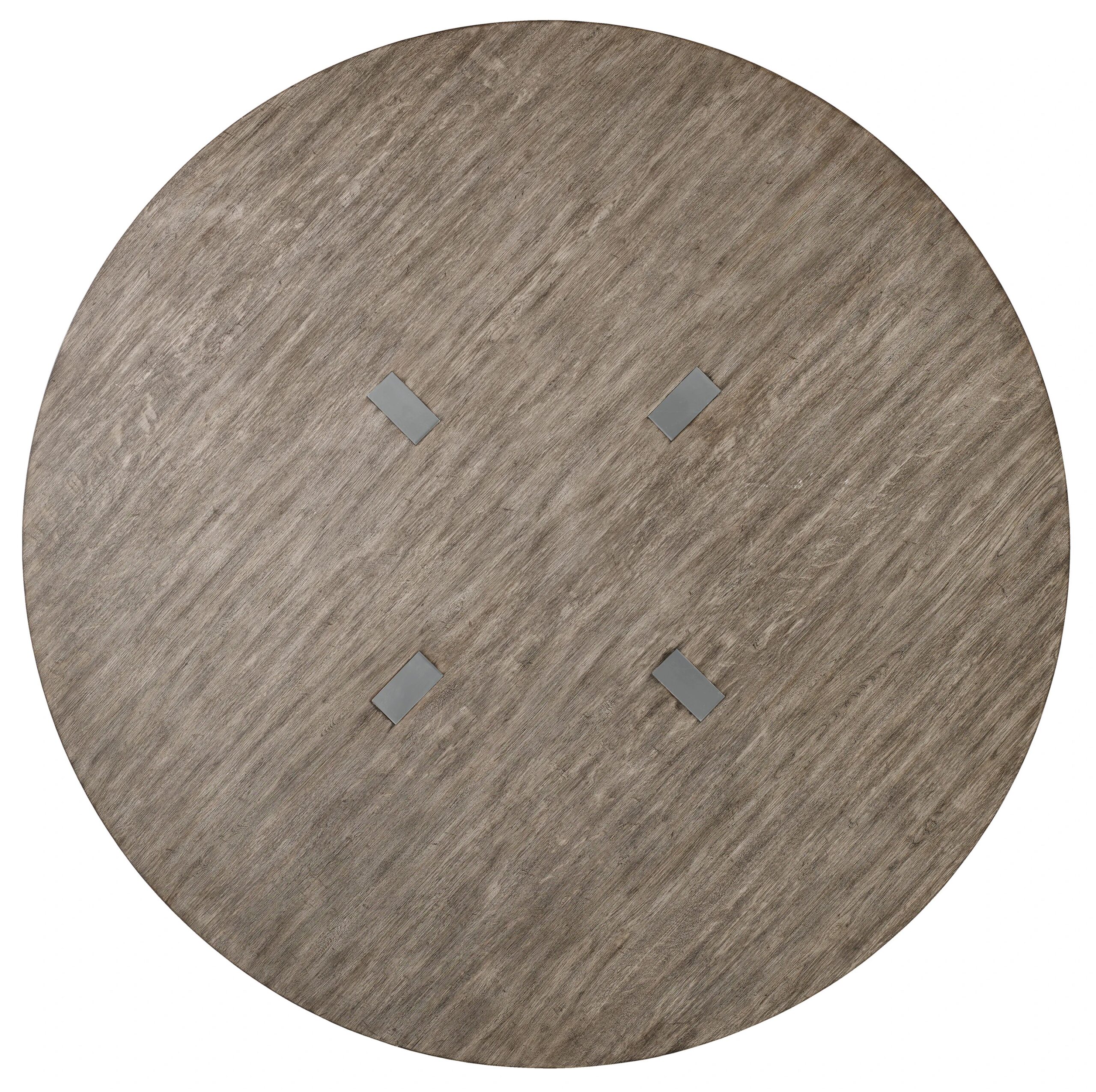 The round dining table in 72-inch and 60-inch sizes combine the Mountain Modern finish on top with a plated black nickel base.