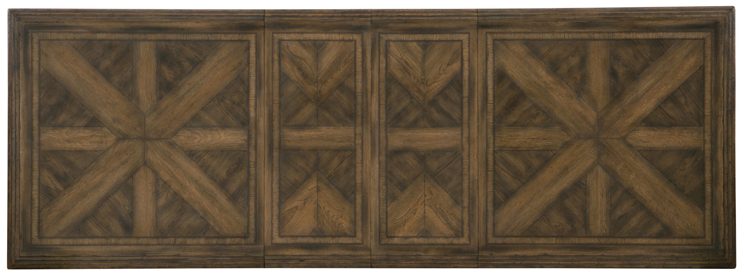 The Bandera trestle-style dining table, inspired by the bigger-than-life Hill Country of Texas, is crafted of flat-cut rustic white oak veneer for an authentic look of rustic elegance. With both 18-inch leaves, the table expands to 122 inches and seats up to 10 guests.